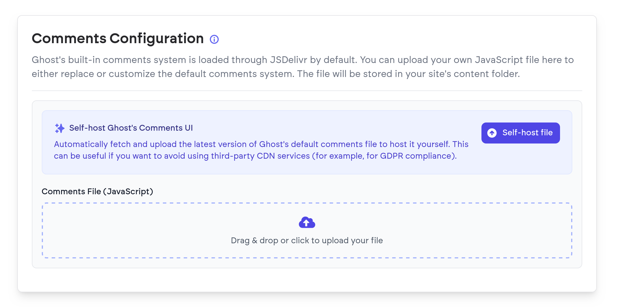 Part of that was the ability to upload Javascript files for both Ghost's Comments UI and the Portal. These files are usually loaded from external content delivery networks, sometimes leading to slower page loads.
